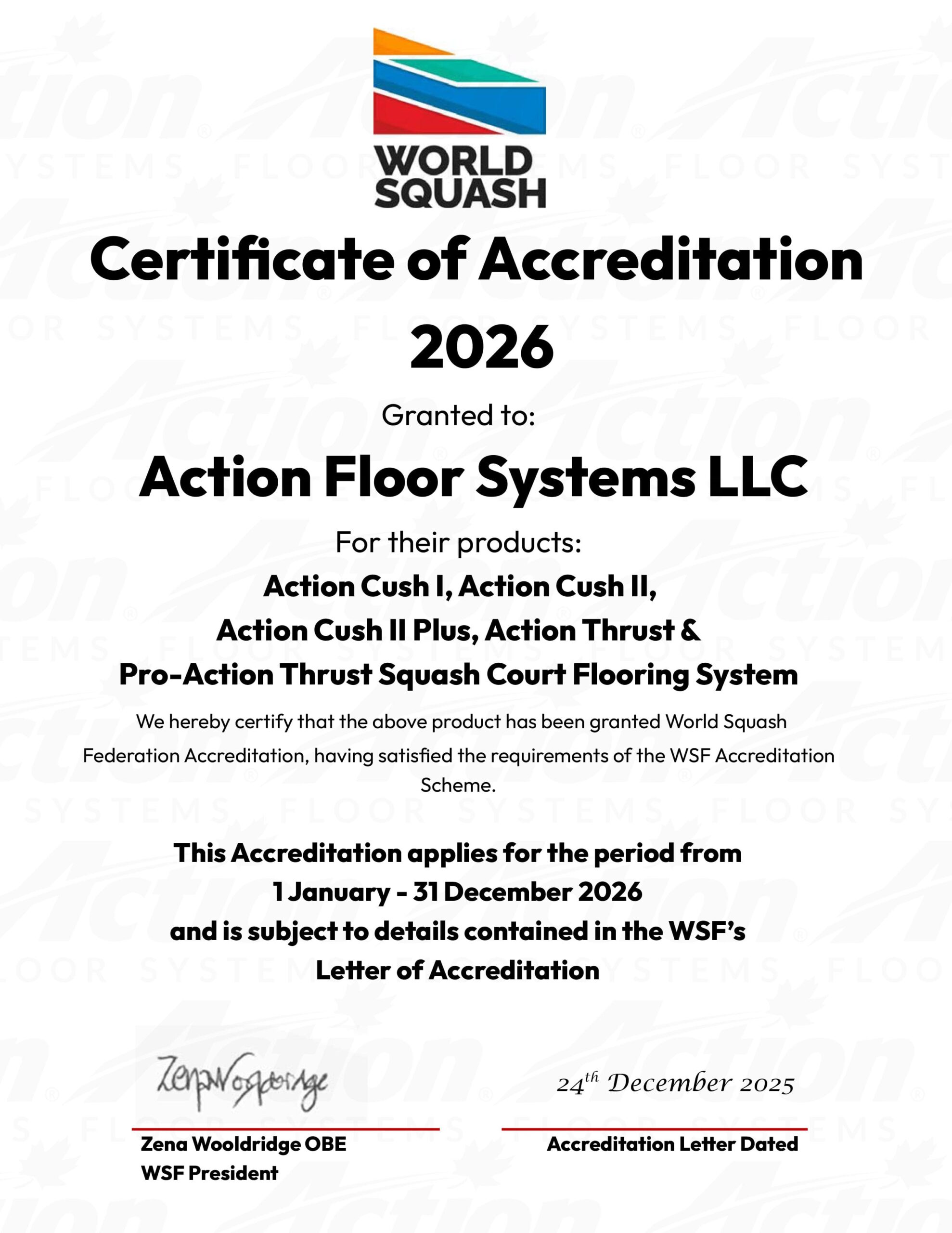 Action has earned approval to be listed as a WSF Accredited Court Manufacturer. This worldwide sports authority maintains strict accreditation requirements for products that are allowed to feature WSF Approval statements.